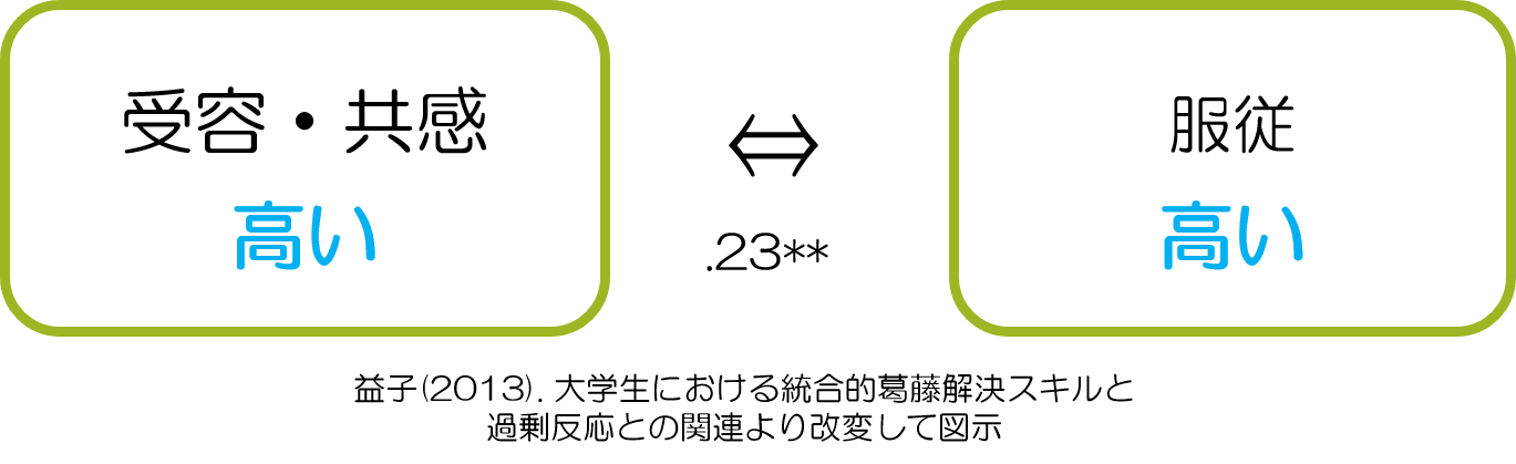 このように、受容・共感と服従の間にプラスの相関が示されました。共感性が強い女性は、相手の気持ちを理解しすぎて、いつの間にか相手に、合わせすぎてしまうと推測できます。