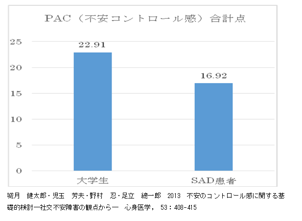 城月健太郎(2013)[9]は、社交不安症(SAD)患者14名と大学生251名に対し、不安のコントロール感に関する調査を行いました。結果が下図となります。
